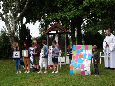 Puis ce sont les enfants de l’école de Mormaison qui sont venus fêter Marie vendredi 20 mai. L’orage de la nuit avait bien un peu humidifié les pelouses mais c’était sans compter l’imagination des enseignants, tout le monde fut au sec.