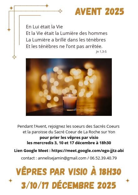 Invitation pour l’AVENT Posted on 18 novembre 2025 by Soeurs des Sacrés Coeurs LIEN GOOGLE MEET : https://meet.google.com/ego-jjtz-abi Télécharger l'article au format PDF