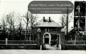 À partir d’octobre 1914, l’hôpital d’Auchel est réquisitionné pour accueillir les blessés du front de l’Artois et soigner les maladies contagieuses. Durant toute la durée du conflit, les sœurs assurent une présence continue au chevet des malades, suscitant l’admiration du personnel militaire. En 1917, huit religieuses du Sacré Cœur exercent à l’hôpital d’Auchel.