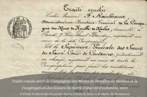 C’est dans ce contexte que le directeur de la Compagnie des mines de Marnes, qui aménage un hôpital destiné aux ouvriers d’Auchel (Pas-de-Calais), sollicite les Sœurs du Sacré Cœur de Coutances afin d’assister le docteur Hernu (1849-1920), dans les soins aux blessés. Il s’agit de la première implantation de la Congrégation dans un milieu industriel et ouvrier, dont elles vont découvrir la difficulté du travail minier et les malheurs.